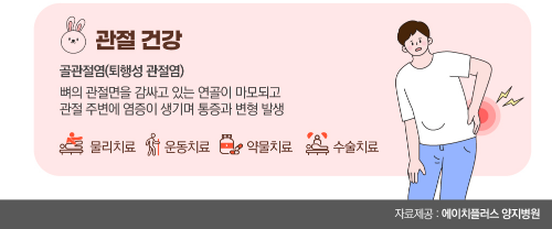 관절 건강을 위해선 무엇보다 건강한 식습관과 꾸준한 운동이 중요하다. 금연과 절주 실천, 채소와 과일을 많이 먹는 식사 습관, 하루 30분, 주 4회 이상 유산소 운동 실천, 자신에게 맞는 근력운동으로 뼈와 관절을 보호하는 것이 좋다.