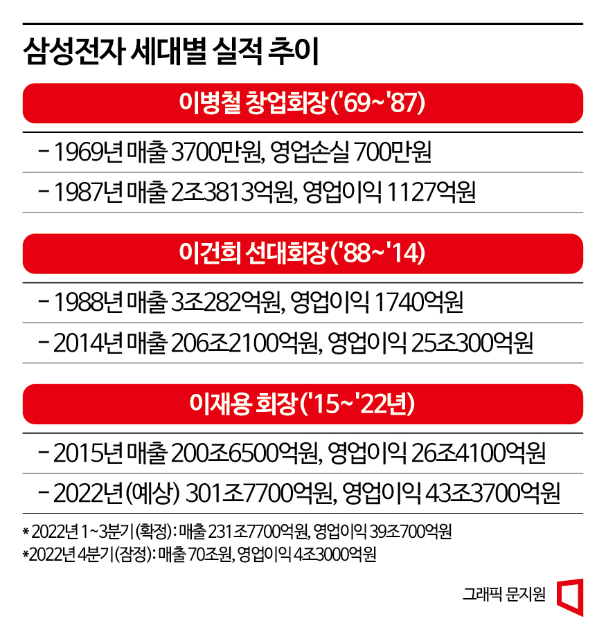 연 평균 영업이익 역시 3대 가운데 이 회장 시절이 가장 많다. 지난 2015~2022년 8년간 삼성전자의 연 평균 40조8725억원의 영업이익을 기록했다. 선대회장 시절(1988~2014) 연 평균 8조5117억원의 4.8배 이상이다. 창업회장 시절(1969~1987)에는 삼성전자 영업이익이 연 평균 355억원에 불과했다.