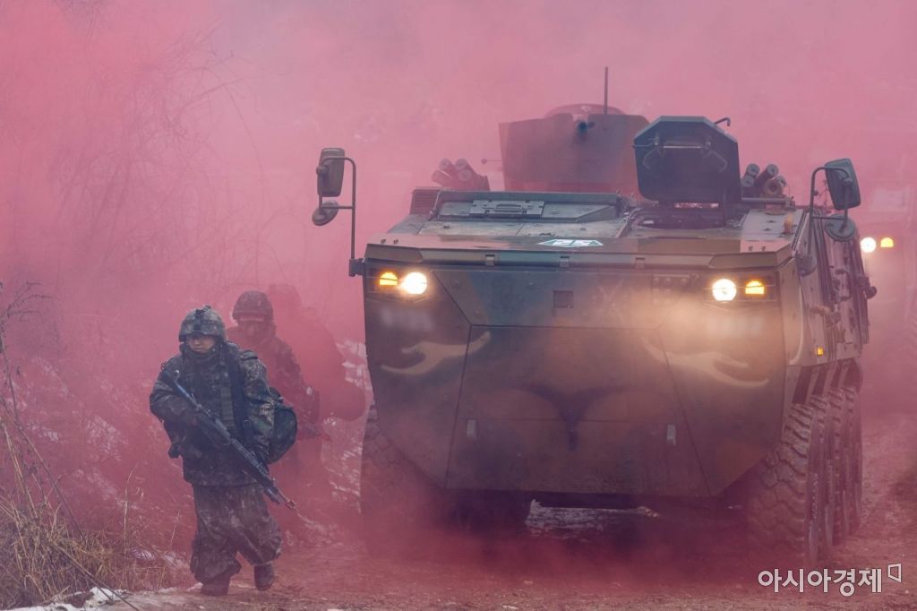 13일 경기 파주 무건리훈련장에서 열린 '아미타이거 시범여단 연합훈련'에서 육군 아미타이거 시범여단 대원들이 분대 전술훈련을 하고 있다.사진=강진형 기자aymsdream@