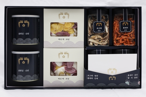 당시 구성품은 김포 문배주 또는 꿀, 전남 광양의 매실액, 경북 문경의 오미자청, 충남 부여의 밤 등 지역 특산물이었으며 연하장도 동봉됐다.