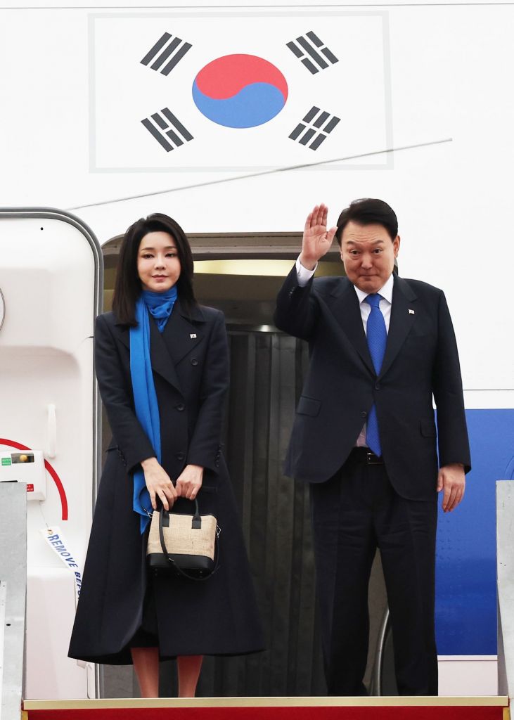 윤 대통령은 검은색 정장에 파란 넥타이, 김건희 여사는 검은색 투피스 정장에 베이지색 구두, 파란색 스카프 차림이었다.