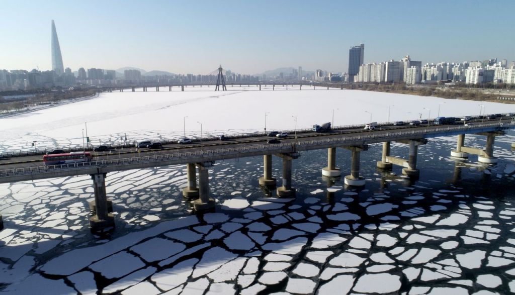 지난달 28일 서울 광나루한강공원 일대 한강이 새벽 중부지방에 내린 눈으로 하얗게 덮여 있다. [이미지출처=연합뉴스]