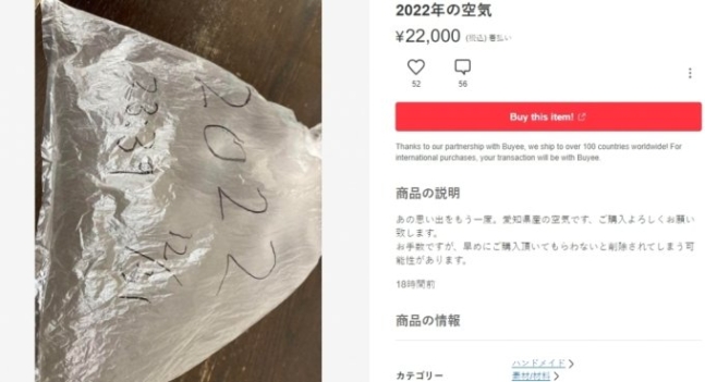 최근 일본의 한 중고거래 사이트에는 비닐봉지 판매 글이 여럿 올라왔다. 판매자들은 공기가 든 채로 입구가 묶인 비닐봉지 사진을 올리고 "지난해의 공기가 담겼다"고 주장했다. 사진을 보면 비닐봉지 위에는 '2022', '2022년의 공기' 등의 문구가 적혀있다.
