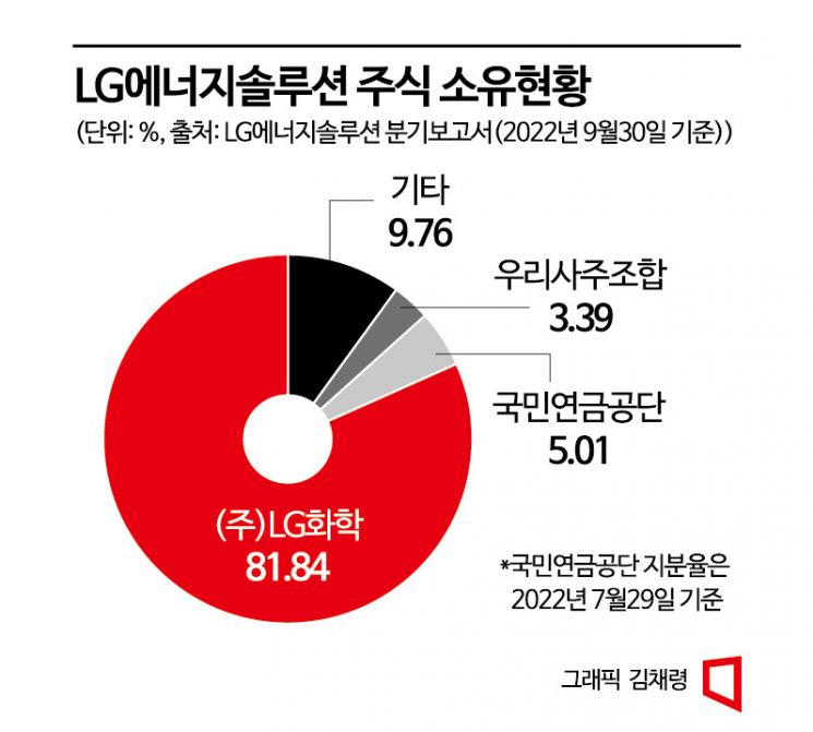LG에너지솔루션 상장 당시 총 850만주가 우리사주조합에 배정됐고, 최종 청약 경쟁률은 0.95대 1을 기록했다. 우리사주 물량은 792만5000주로, 전체 발행주식의 3.39%다. 이 밖에 LG화학이 81.84%, 국민연금이 5.01%의 LG에너지솔루션 주식을 보유하고 있다. 실질 유통물량이 전체 주식 대비 13.15% 규모임을 감안하면, 유통물량의 약 23%가 시장에 나오는 셈이다.