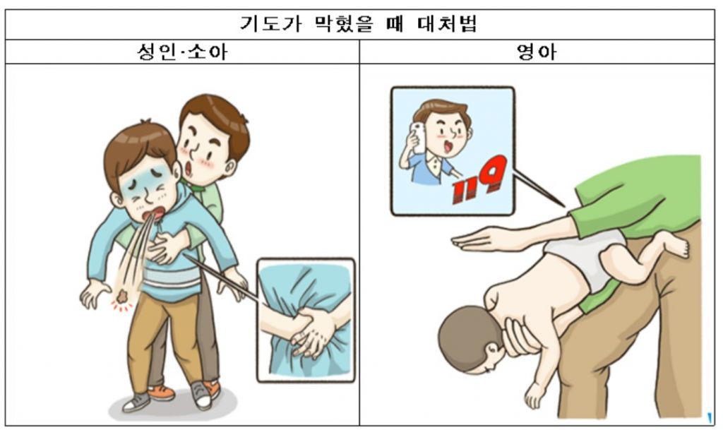 음식을 먹다가 기도에 막혔다면 환자가 기침을 할 수 있는지 기침을 하도록 해야 한다. 할 수 없다면 기도폐쇄에 대한 응급처치법(하임리히법)을 실시한다. 환자가 성인이면 뒤에서 감싸듯 안고 한 손은 주먹을 쥐고 다른 한 손은 주먹 쥔 손을 감싼 뒤 환자의 명치와 배꼽 중간지점에 대고 위로 밀쳐 올린다. 소아라면, 1세 이하 혹은 체중 10kg 이하 소아는 머리가 아래를 향하도록 허벅지 위에 엎드려 눕힌 후 손바닥 밑부분으로 등의 중앙부를 세게 두드리는 ‘등 압박’과, 양쪽 젖꼭지를 잇는 선의 중앙 부위 약간 아래를 두 손가락으로 4cm 정도 깊이로 강하고 빠르게 눌러주는 ‘가슴 압박’을 반복한다.