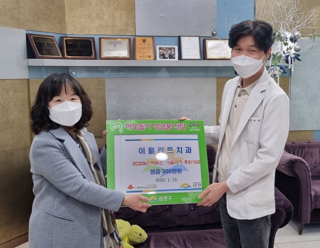독산동 이플란트치과의원 김영석 원장이 독산1동 주민센터에 성금 300만 원을 기탁했다.