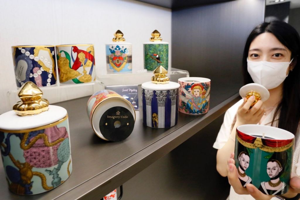 갤러리아명품관 기프트샵에서 모델이 '이미저리 코드'의 향초를 소개하고 있다(사진=갤러리아 제공).