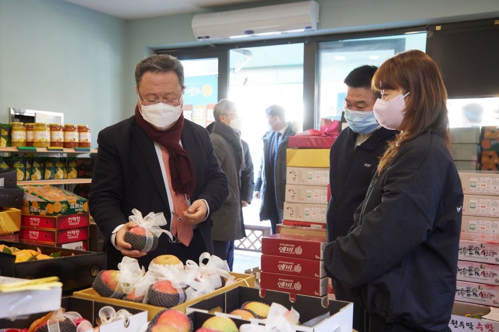 시석중 경기신용보증재단 이사장이 전통시장을 찾아 상인들과 이야기를 나누고 있다. 사진=경기신보 제공