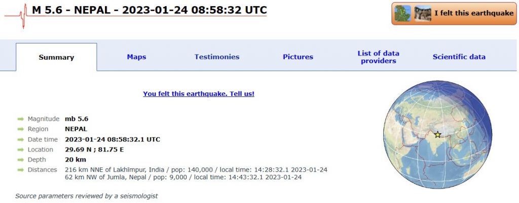 유럽지중해지진센터(EMSC)에 따르면 지진은 네팔 줌라에서 북서쪽으로 63km 떨어진 지역에서 발생했다. 지진 발생 깊이는 10km다.