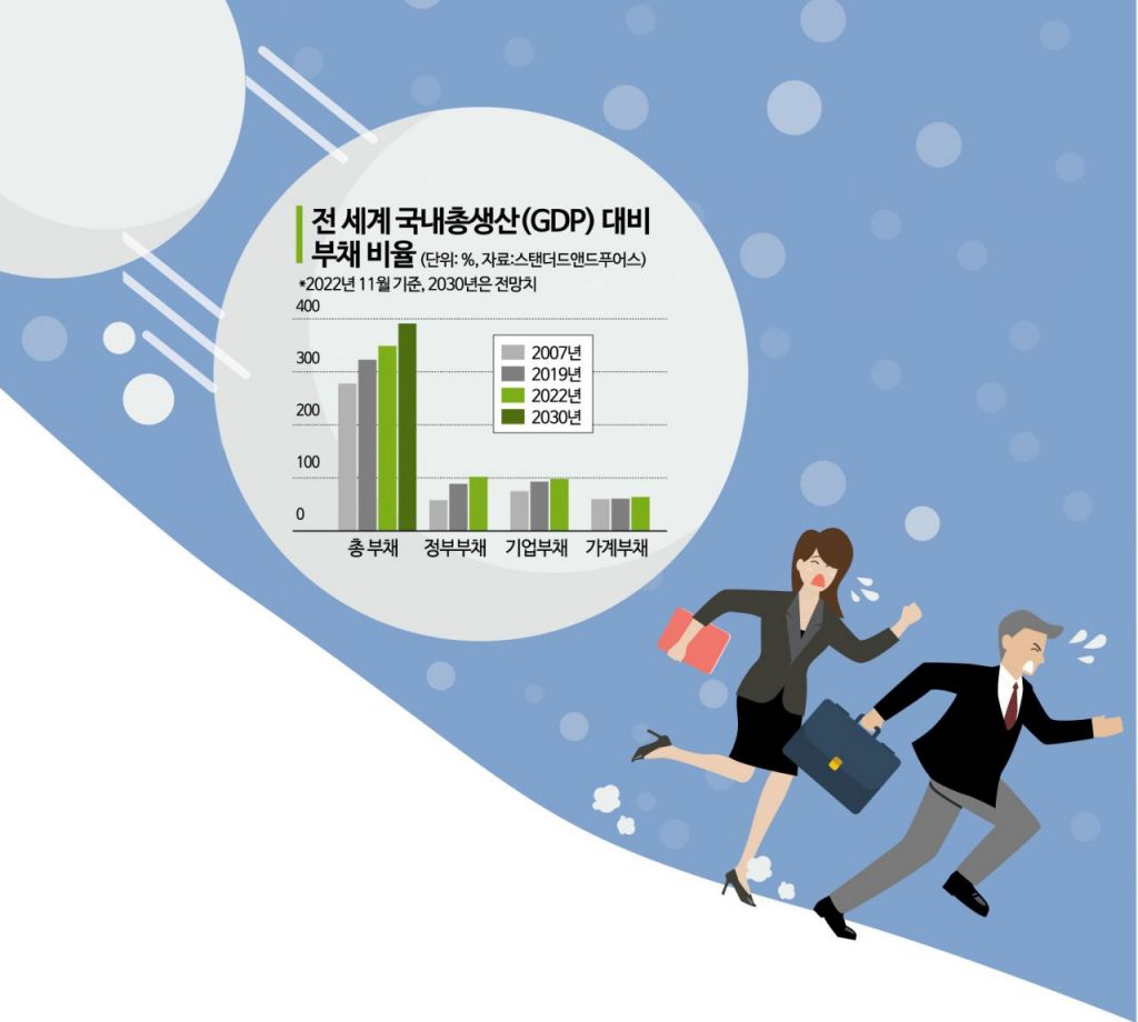 세계 부채는 글로벌 금융위기 직전인 2007년만 해도 GDP 대비 비율이 278%였지만 꾸준히 상승하고 있다. 2019년에는 이보다 높은 323%, 2022년엔 350%에 가까운 수준까지 올라갔다. 코로나19 이후 각국 정부가 재정 지출을 확대하고, 중국 국영기업들이 정부 정책을 뒷받침하면서 부채를 크게 늘려왔기 때문이라고 S&P는 분석했다.