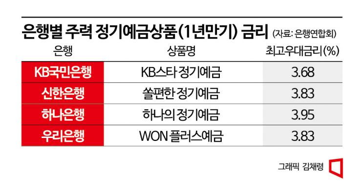 26일 은행연합회 공시에 따르면 이날 기준 4대 시중은행(KB국민·신한·하나·우리)의 주력 정기예금 상품(1년 만기)의 금리 상단은 3.68~3.95%로 집계됐다. 지난해 11월 한 때는 5%대, 최근까지도 4%대를 유지하고 있던 시중은행의 정기예금 금리가 급락세를 보인 것이다.