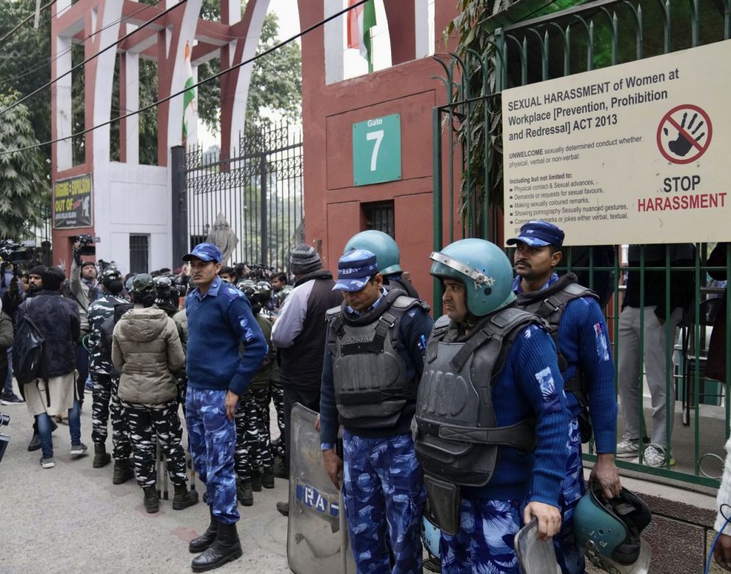25일(현지시간) 인도 뉴델리의 자미아밀리아이슬라미아(JMI) 국립대학의 출입문을 보안요원들이 통제한 가운데 학생들과 대치하고 있다. 일부 학생들이 나렌드라 모디 총리를 비판한 내용의 BBC 다큐멘터리 시사회를 열려고 하자 학교측이 정문을 폐쇄했다. 뉴델리=AP·연합뉴스
