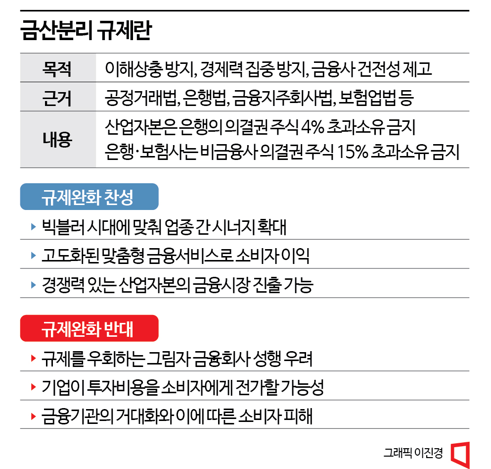반발을 무릅쓰고 금산분리 규제를 풀었다가 도로 회귀한 적도 있다. 이명박 전 대통령은 2009년 산업자본이 금융자본의 의결권 있는 주식을 9%까지 보유할 수 있도록 허용했다. 하지만 경제민주화 바람이 불면서 2013년 다시 보유한도를 4%로 줄이는 '금산분리 강화법'이 국회 본회의를 통과해 4년 만에 무산됐다.