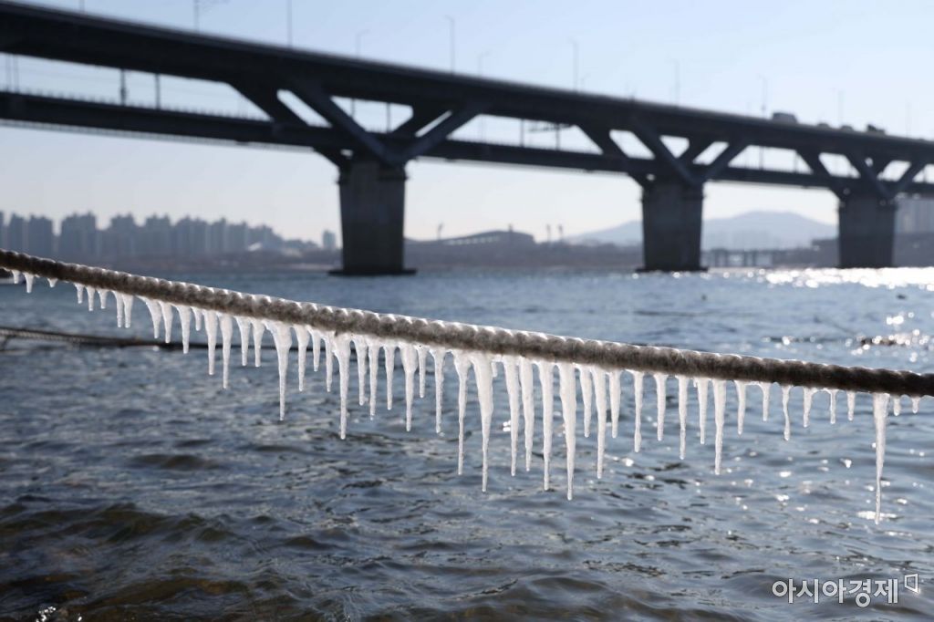 전국 대부분 지역에 한파주의보가 내려진 2022년 1월 11일 서울 광진구 뚝섬한강공원에 얼음이 얼어 있다.