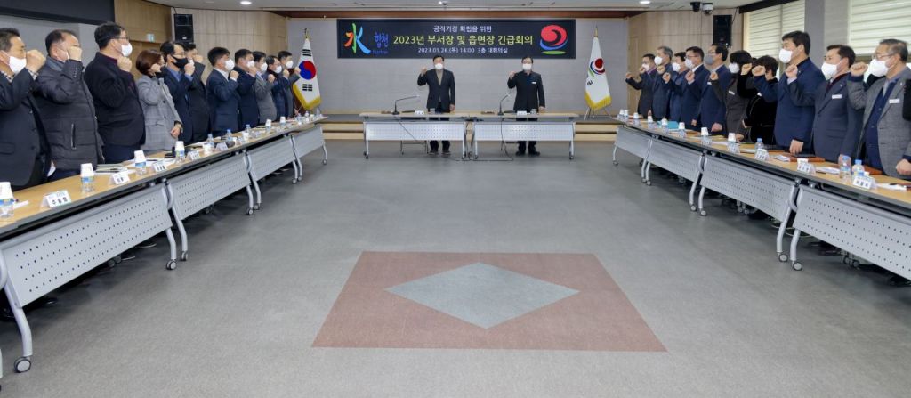 경남 합천군이 공직 기강 확립을 위한 부서장 및 읍면장 긴급 회의를 하고 있다.