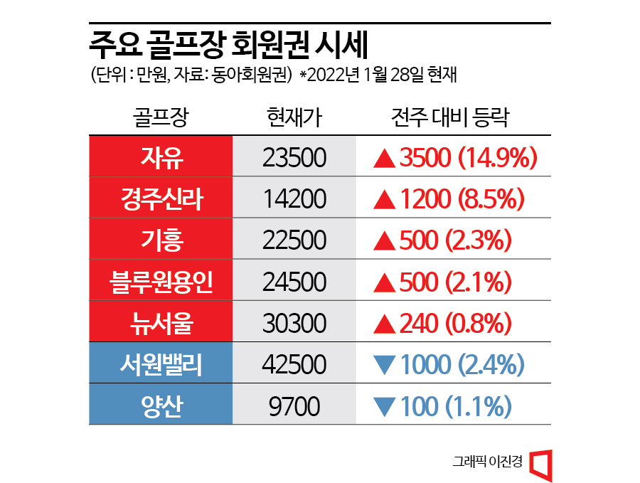 이윤희 동아회원권거래소 남부권 팀장은 "남부권 회원권 시장은 저점 매수 타이밍을 기다렸던 매수세가 강하게 유입되고 있다"면서 "매매 문의가 계속해서 증가할 것으로 예상된다"고 말했다.