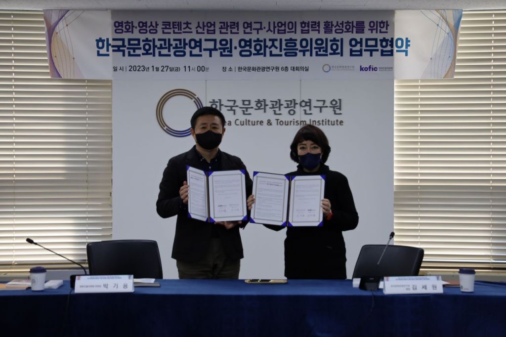 한국문화관광연구원과 영화진흥위원회는 27일 영화·영상 콘텐츠 산업 관련 연구·사업 활성화를 위한 업무협약을 맺었다. 골자는 보고서·간행물·데이터 상호 제공·활용과 연구·사업 협력이다. 인적교류를 통한 주요 이슈 논의, 정책 협력 활성화 등의 내용도 포함됐다. 연구원은 "한국 영화·영상에 관한 관심이 세계적 현상으로 확대되는 추세"라며 "변화에 발맞춰 관련 산업을 선도할 연구를 추진하고, 데이터 분석으로 정책 고도화 방향을 모색하겠다"라고 설명했다. 이어 "검증된 경쟁력이 콘텐츠 전 분야로 확대되는 계기가 되길 기대한다"라고 했다.