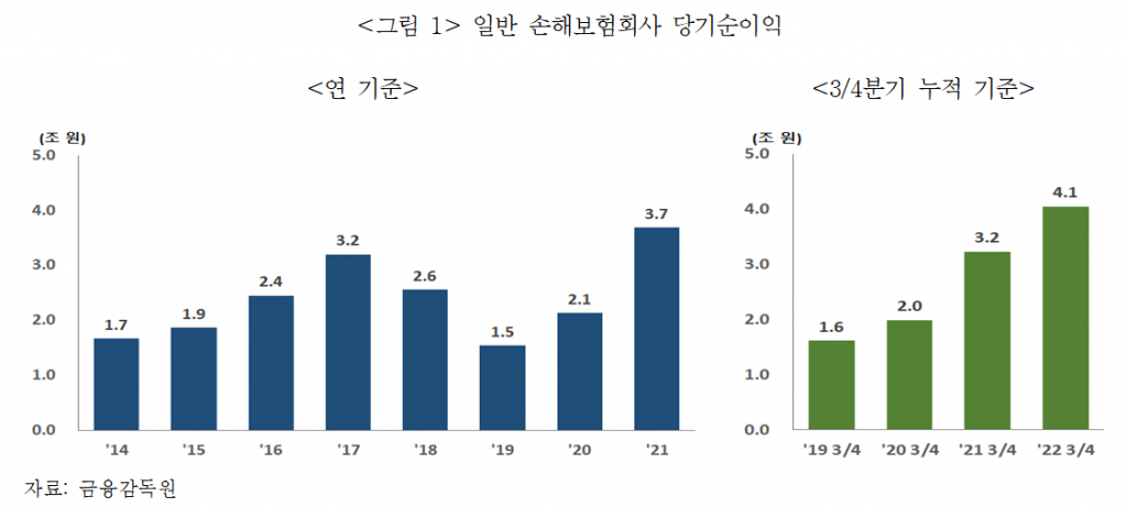 29일 보험연구원은 '손해보험사의 이익집중도와 수익성 편차' 보고서를 통해 이같이 진단했다. 보고서에 따르면 금융감독원 금융통계정보시스템상 일반손보사로 분류되는 11곳(·NH손보·롯데손보·메리츠화재·삼성화재·MG손보·KB손보·하나손보·한화손보·현대해상·흥국화재)의 지난해 순이익은 역대 최대 수준으로 예상된다. 앞서 2020년 코로나19로 인한 반사효과로 당기순이익이 증가세로 반전된 이후 크게 늘어나 지난해 3분기에는 당해 누적 당기순이익이 4조1000억원을 넘어설 정도였기 때문이다.