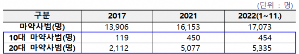 2017년 전체 마약사범 1만3906명 중 119명에 그쳤던 10대 마약사범은 2021년 450명, 지난해 11월까지 454명으로 4배 가까이 증가했다. 2017년 2112명이었던 20대 마약사범도 2021년 5077명, 지난해 11월까지 5335명으로 2배 이상 증가했다.
