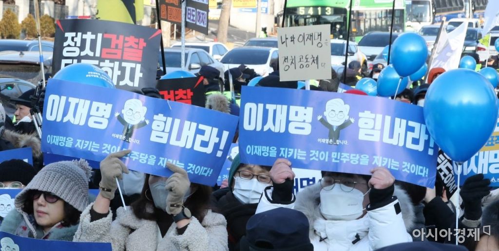 이재명 더불어민주당 대표가 대장동 개발 특혜 의혹 사건 관련 검찰 조사를 받은 28일 서울 서초구 중앙지검 앞에서 이 대표 지지단체가 응원 구호를 외치고 있다. 사진=김현민 기자 kimhyun81@
