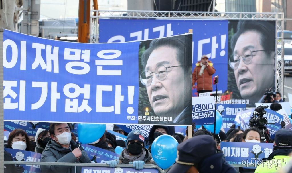 이재명 더불어민주당 대표가 대장동 개발 특혜 의혹 사건 관련 검찰 조사를 받은 28일 서울 서초구 중앙지검 앞에서 이 대표 지지단체가 응원 구호를 외치고 있다. 사진=김현민 기자 kimhyun81@