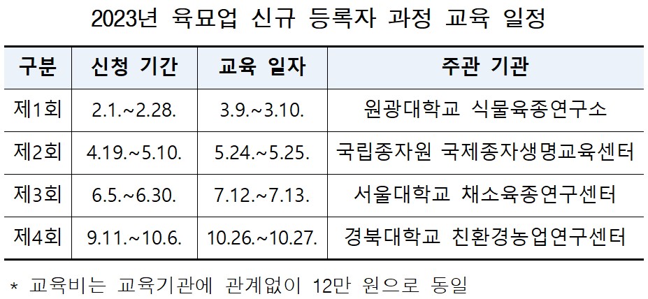 올해 교육은 코로나19 거리두기 완화에 따라 집합교육으로 운영된다. 원광대(3월), 국립종자원(5월), 서울대(7월), 경북대(10월) 순으로 총 4회, 매회 100명의 수강생을 받을 계획이다. 교육비는 교육기관에 관계없이 12만원으로 동일하다.