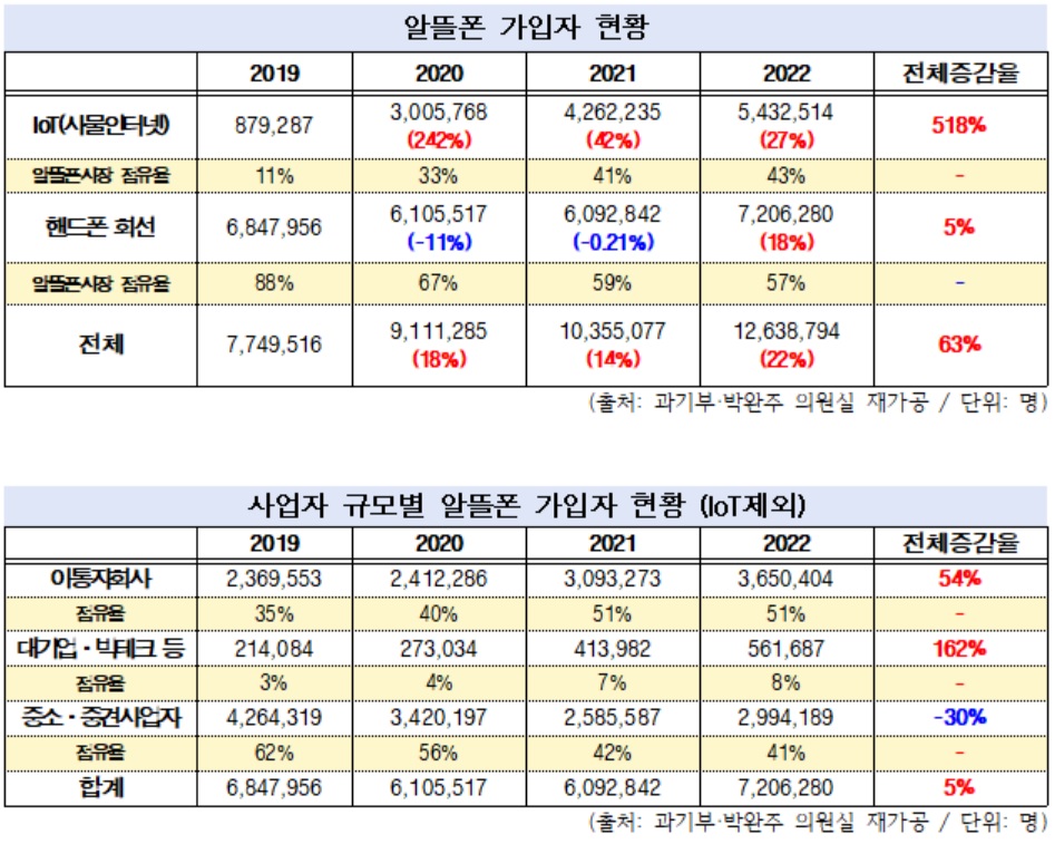 29일 박완주 의원실은 과학기술정보통신부로부터 제출받은 자료를 통해 알뜰폰 가입자 수가 급증한 최대 요인은 2019년 대비 2022년 사물인터넷(IoT) 회선 수가 518% 증가했기 때문이라고 밝혔다. 휴대폰 회선 가입자 수는 같은 기간 5% 증가하는 데 그쳤다.