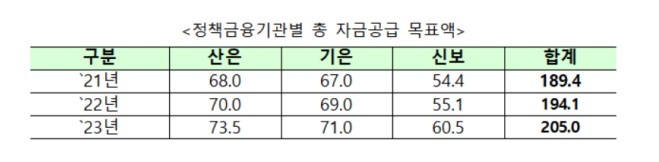 금융위의 2023년 주요업무 추진계획을 보면 올해 정책자금공급액은 205조원으로 지난해보다 11조원 늘어났다. 특히 '5대 중점전략 사업'에 81조원을 공급한다. 5대 중점전략 사업은 ▲글로벌초격차 산업 지원 ▲미래유망산업 육성 ▲사업재편 및 산업구조 고도화 ▲유니콘 벤처·중소·중견기업 육성 ▲기업경영애로 해소로 이뤄져있다.