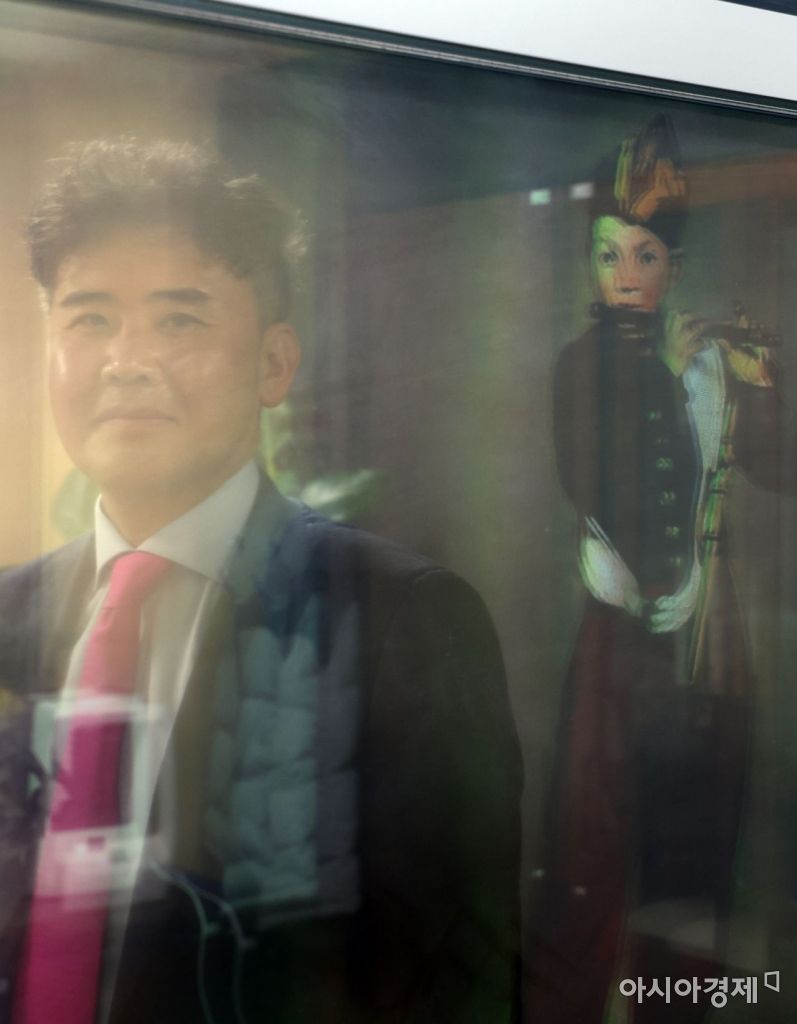 한국 디스플레이산업협회 이동욱 상근부회장. 서울 역삼동 집무실에는 투명 OLED가 설치되어 있다. 화면 반대편에서 포즈를 취했다. 저편에서는 반대편이 안 보인다. 사진=허영한 기자 younghan@