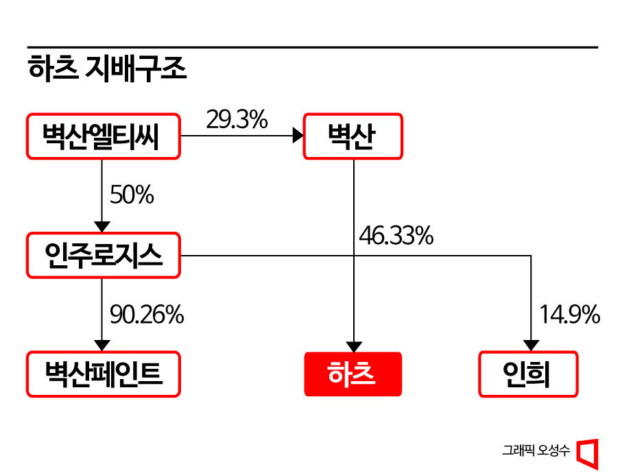 벽산은 아파트 건축 이후 주방에 설치·공급되는 하츠의 가전제품 사업이 기존 벽산의 건축자재업과 시너지 효과를 낼 것으로 기대했다. 초기 하츠 창업자의 지분 31.29%를 인수한 데 이어 지분을 추가로 사들여 46.33%를 유지하고 있다. '벽산엘티씨엔터프라이즈→벽산→하츠'로 이어지는 지배구조인 셈이다.