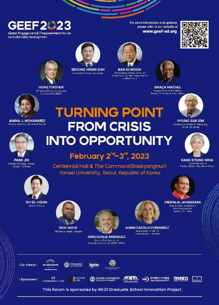 [아시아경제 유병돈 기자] 연세대학교는 다음 달 2일과 3일 이틀에 걸쳐 ‘터닝포인트;위기를 기회로’라는 주제로 ‘제5회 글로벌지속가능발전포럼(GEEF2023)’을 개최한다.