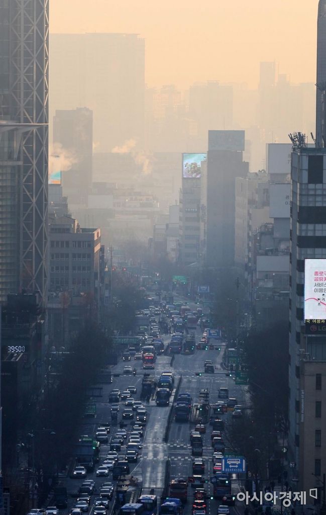 초미세먼지가 '나쁨' 수준을 보인 27일 서울 종로 일대가 뿌옇게 보이고 있다./김현민 기자 kimhyun81@