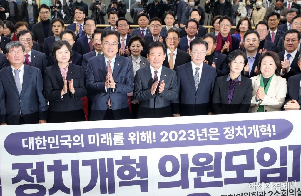 30일 국회에서 열린 초당적 정치개혁 의원 모임 출범식에 참석한 김진표 국회의장과 정진석 국민의힘 비대위원장, 이재명 더불어민주당 대표 등 여야 의원들이 기념촬영을 하고 있다. 사진=윤동주 기자 doso7@