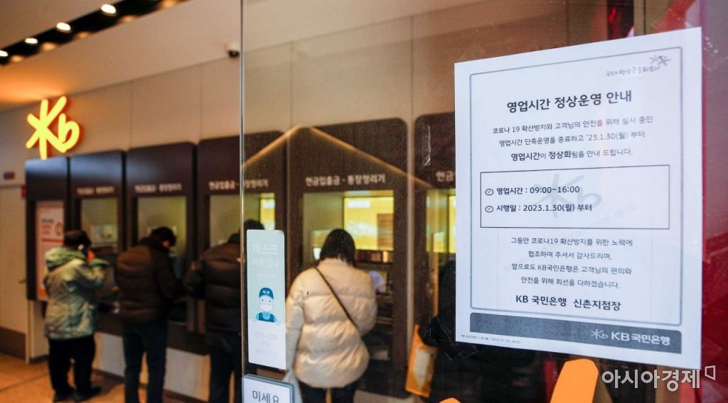 일부 시설을 제외하고 실내마스크 착용이 의무에서 권고로 전환된 30일 서울 서대문구 국민은행 신촌지점에 영업시간 정상운영 안내문이 붙어 있다. 사진=강진형 기자aymsdream@