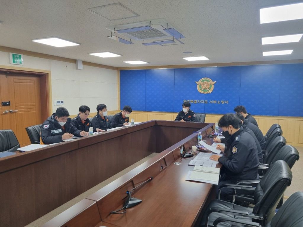 제주서부소방서가 30일 소회의실에서 겨울철 소방안전대책 목표 달성을 위한 중간평가 보고회를 개최했다.[사진제공=제주서부소방서]