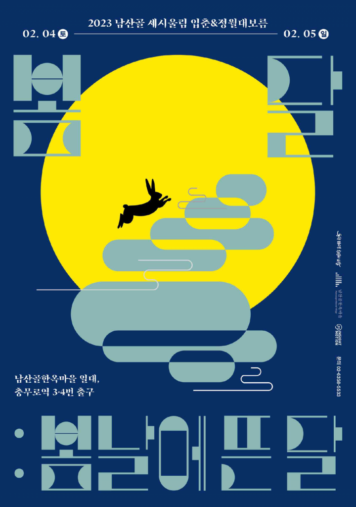 [아시아경제 성기호 기자] 서울시 남산골한옥마을은 다음달 4일과 5일 양일간, 입춘·정월대보름맞이 세시행사인 ‘2023 남산골 세시울림 입춘·정월 대보름 <봄달 : 봄날에 뜬 달>’ 행사를 개최한다. 올해 행사는 2019년 이후 4년 만에 대면으로 개최되는 행사로 더욱 뜻깊다.