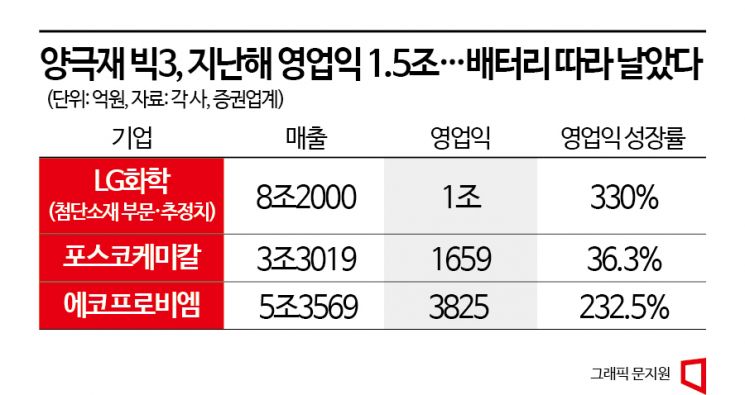 국내 양극재 제조 기업 LG화학 첨단소재 부문(추정 영업이익 1조원)·포스코케미칼 (1659억원)·에코프로비엠(3825억원)이 1조5000억원이 넘는 영업이익을 낸 것으로 나타났다. 앨앤에프·코스모신소재 등 중견·중소기업의 실적까지 합치면 국내 양극재 기업들이 지난해 벌어들인 돈은 2조원에 육박할 것으로 보인다.
