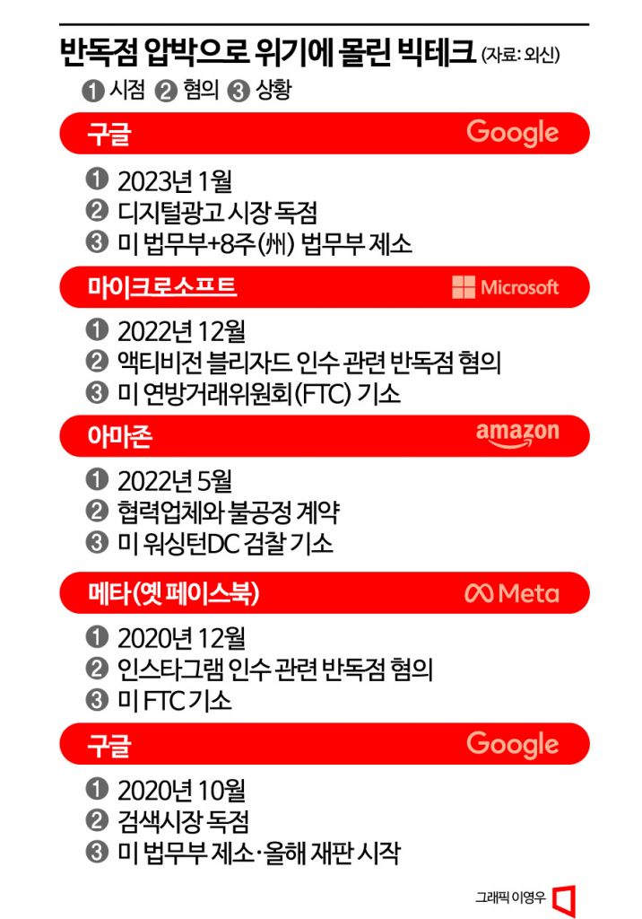◆"방종의 시대는 끝났다"= 미 법무부는 올 들어 다시 한 번 빅테크 규제에 팔을 걷었다. 지난달 24일(현지시간) 워싱턴DC 청사에서 기자회견을 열고 세계 디지털 광고 시장을 지배하고 있는 구글을 반독점법 위반 혐의로 고소하고, 최대 수익원인 광고 부문 사업 퇴출을 요구했다고 밝혔다. 법무부는 "구글은 (자사의) 디지털 광고 기술 지배력에 대한 위협을 제거하거나 이 위협의 정도를 약화하기 위해 반경쟁적이고, 배타적이며, 불법적인 수단을 썼다"고 지적했다.
