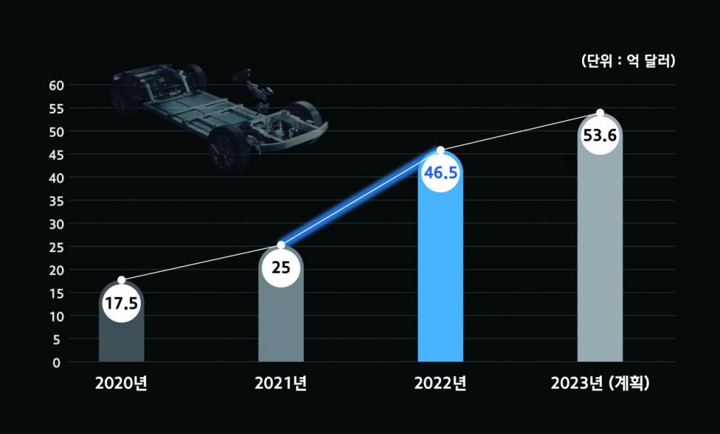 현대모비스의 글로벌 수주는 수년간 증가세다. 2020년 17억5000만달러, 2021년 25억달러, 지난해엔 46억5000만달러를 기록했다. 올해는 53억6000만달러 수주를 목표로 잡았다.