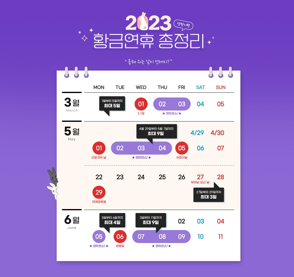 올해 3월과 5월, 6월에는 각각 공휴일과 연차를 활용하면 최소 3일부터 최대 9일까지 연휴를 보낼 수 있다. 하나투어에 따르면 기간에 따라 선호하는 지역이 다른 것으로 나타났다. 3월1일 출발하는 고객 기준 예약 지역 비중은 동남아시아(65%), 일본(25%), 유럽(5%) 순이었다. 4월29일 출발일의 경우 유럽(76%)과 일본(11%), 동남아(10%)로 연휴가 길수록 장거리 여행지인 유럽 선호도가 높은 것으로 집계되고 있다.
