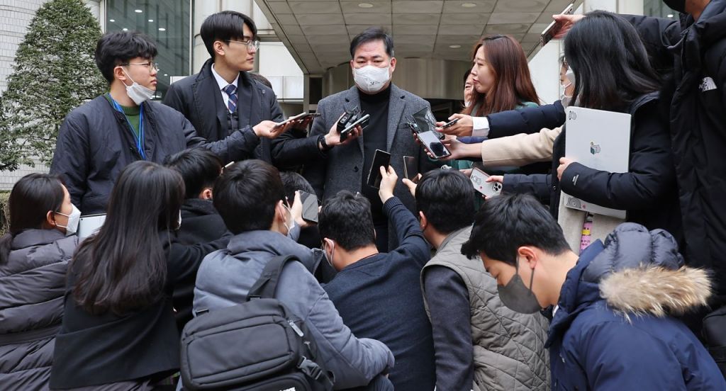 이재명 더불어민주당 대표의 최측근인 정진상 전 대표실 정무조정실장에게 뇌물을 건넨 혐의를 받는 유동규 전 성남도시개발공사 기획본부장이 31일 오전 서울 서초구 서울중앙지법에서 열린 정 전 실장의 첫 공판준비기일을 마친 뒤 취재진 질문에 답하고 있다. [이미지출처=연합뉴스]