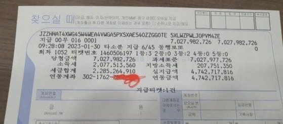 이번 1등 당첨 금액은 23억4168만2762원이며 3등 당첨 금액은 146만7220원이었다. 총 당첨 금액은 70억2798만2726원으로 그야말로 잭폿이 터진 셈이다. 이런 가운데 글쓴이가 실제 받은 실수령액은 47억4271만7816원으로 소득세(20억7751만3560원)와 지방소득세(2억775만1350원) 등이 제했기 때문이다.