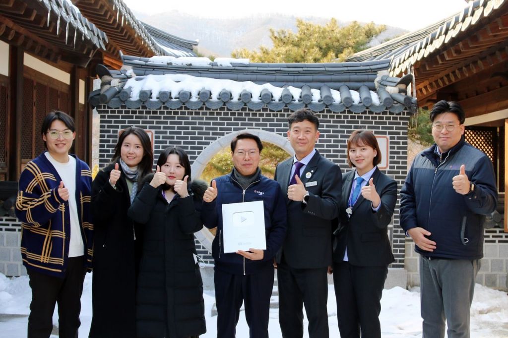 이삼걸 강원랜드 대표(왼쪽 네 번째)가 하이원리조트 공식 유튜브 채널의 실버버튼을 들고 직원들과 기념촬영하고 있다.[사진제공=강원랜드]