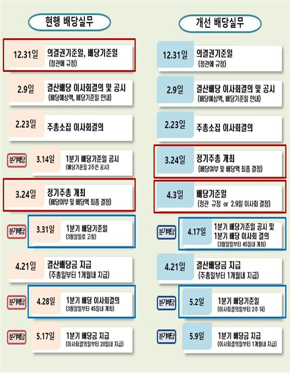 그간 국내 배당 제도는 연말에 배당받을 주주를 먼저 확정하고 그다음 해 봄에 열리는 주주총회에서 배당금을 확정해왔다. 투자자의 경우 배당금을 얼마 받을지 모르는 상태에서 투자하고 몇 달 뒤에 이뤄지는 배당 결정을 그대로 수용해야 해 글로벌 배당주 펀드 매니저 등 해외 투자자들은 지속적으로 한국 배당주 투자를 ‘깜깜이 투자’라고 평가절하하며 제도개선을 지속적으로 요구해왔다.
