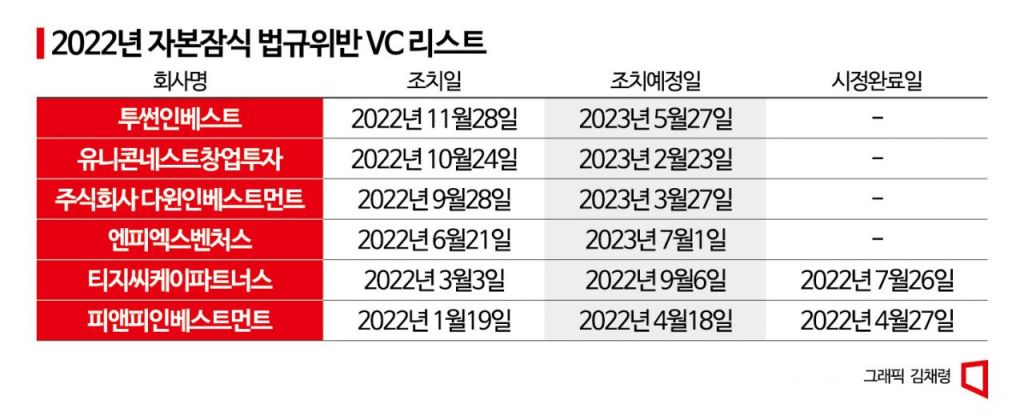 1일 중소기업창업투자회사 전자공시(DIVA)에 따르면 2022년 한 해 동안 ‘자본잠식’ 사유로 중소벤처기업부(중기부)로부터 시정명령을 받은 벤처캐피탈은 투썬인베스트·유니콘네스트창업투자·다윈인베스트먼트·엔피엑스벤처스·티지씨케이파트너스·피앤피인베스트먼트 등 총 6곳으로 나타났다.