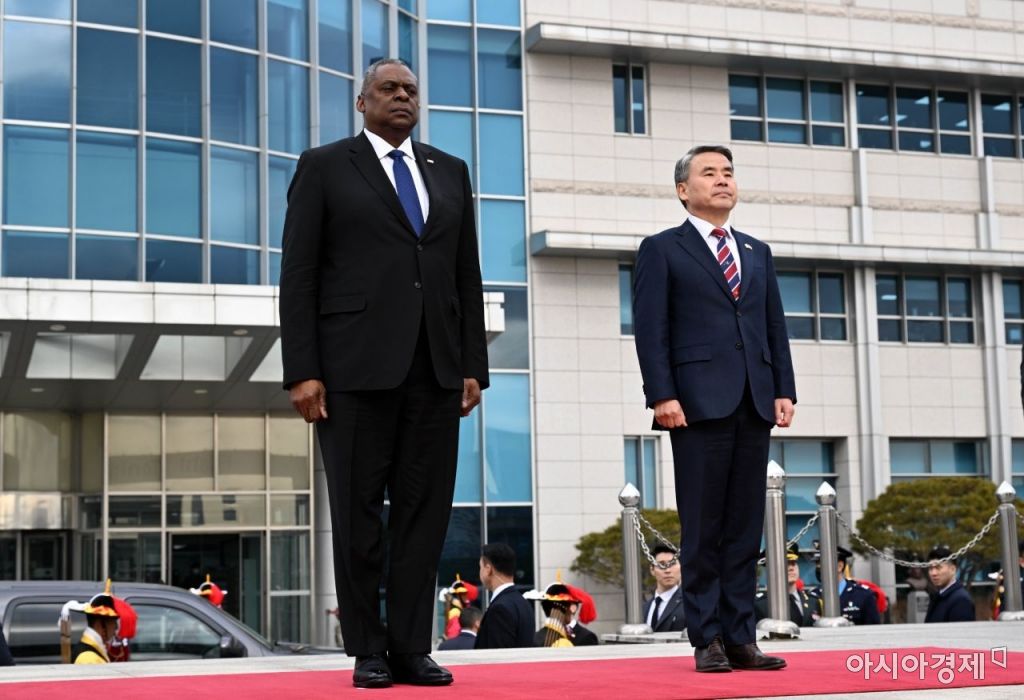 방한중인 로이드 오스틴 미국 국방부 장관과 이종섭 국방부 장관이 31일 서울 용산구 국방부 청사에서 한·미 국방장관 회담을 앞두고 의장대 사열을 받고 있다. 사진=공동취재단