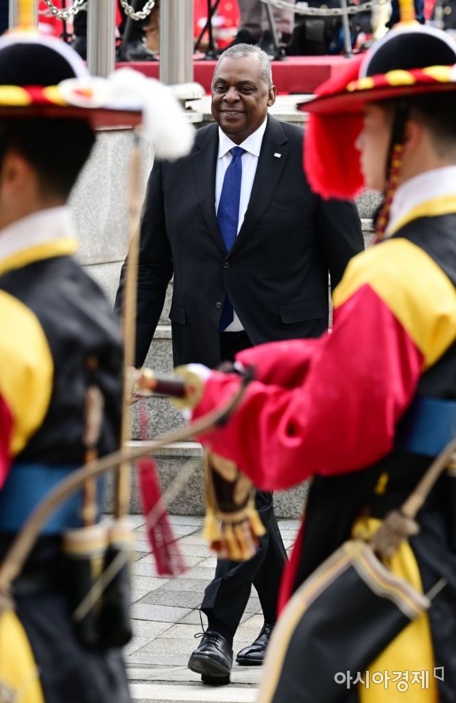 방한중인 로이드 오스틴 미국 국방부 장관이 31일 서울 용산구 국방부 청사에서 한·미 국방장관 회담을 앞두고 의장대 사열을 받은 뒤 회담장으로 이동하고 있다. 사진=공동쥐재단