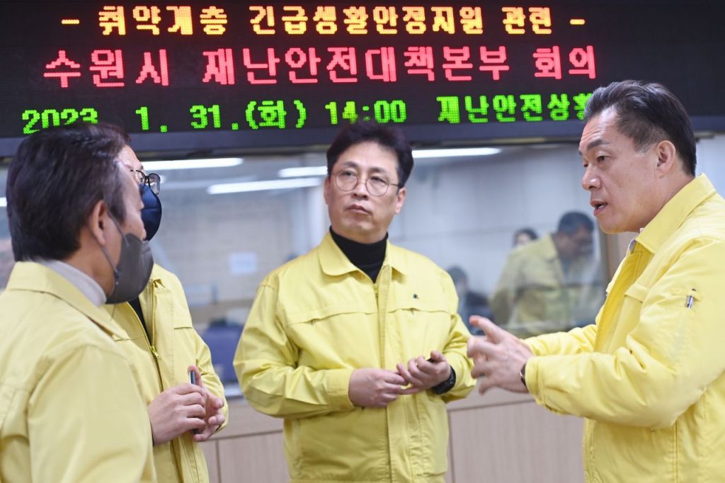 이재준 수원시장(오른쪽)이 31일 취약계층 난방비 지원과 관련, 담당 공무원들과 이야기를 나누고 있다. 사진=수원시 제공