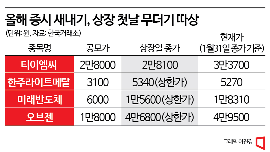 실제 올 들어 상장된 기업들의 상장 당일 주가 추이를 살펴보면, 총 네 곳 중 세 곳이 첫날 상한가를 달성한 후 그대로 거래를 마쳤다. 특히 미래반도체와 오브젠은 시초가가 공모가의 2배에 이르면서 '따상'을 기록했다. 그리고 그 이후에도 주가가 추가로 올라 공모가보다 3배가량(1월31일 종가 기준) 높은 수준에서 주가가 형성됐다. 수요예측 등 절차를 거쳐 공모가가 결정되긴 하지만, 실제 시장 평가와는 괴리가 컸던 셈이다