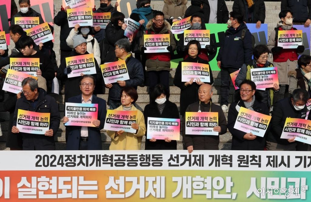 이은주 정의당 원내대표 등 의원들과 선거제 관련 시민사회 단체 회원들이 1일 국회 본청 앞에서 '선거제 개혁'과 관련한 피켓팅을 하고 있다. 사진=윤동주 기자 doso7@